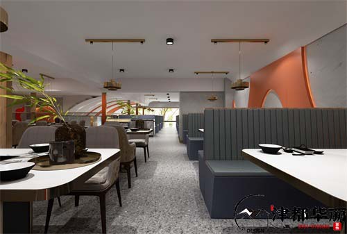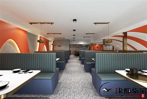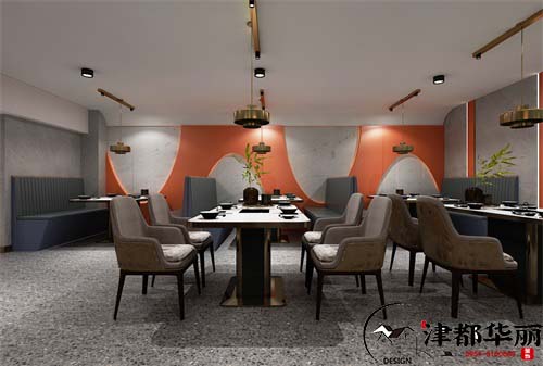 烤肉店已经摆脱了传统的烟熏火燎,烤肉店的装修更加讲究,设备更加完善,环境也更加舒适优美。今天分享的案例是一家时尚浪漫的烤肉店的装修设计,单单从设计效果图上看,我们很难看出这是一家烤肉店,因为空间时尚且有格调,让我们感受到了一股浪漫的空间氛围。首先从空间格局说起,一楼分为前厅和大厅,前厅有收银台和厨房,这样分开设计,可以使空间整洁有序,而且方便兼顾大厅和室外,宽阔的走廊,让整个空间大气舒适。二楼是敞开的大厅和包间设计,可以容纳更多的客人。其次就是装修风格,一楼用金属材料装饰设计,增加了空间的品质感和时尚气息,一楼大厅简单的设计减轻了空间的负担,让空间整洁明亮,清爽舒适。二楼的设计用了橘色点缀,空间更加的温馨浪漫,四人座、六人座和包间能容纳不同的人群,精致的装修装饰,让这里也有了一丝艺术格调。这里环境优美,温馨舒适,听着滋滋的烤肉声,闻着扑鼻的香味,是不是非常的享受和满足。